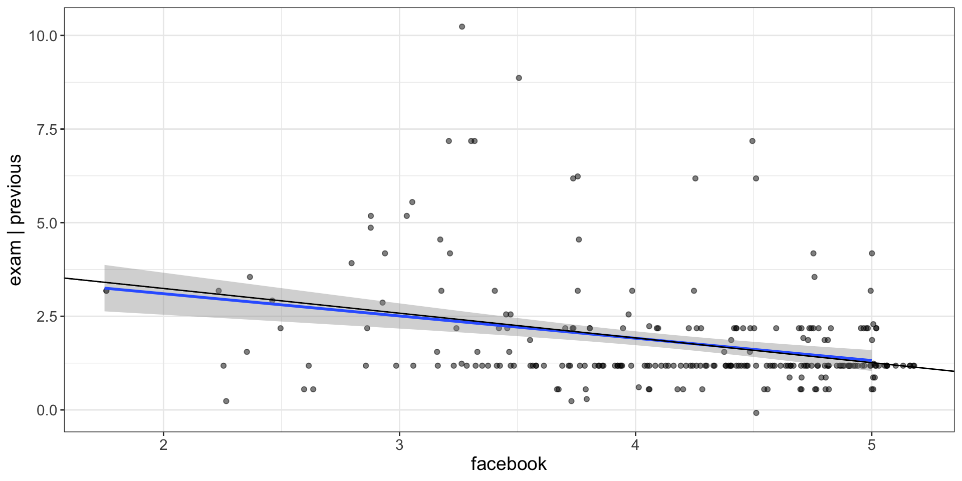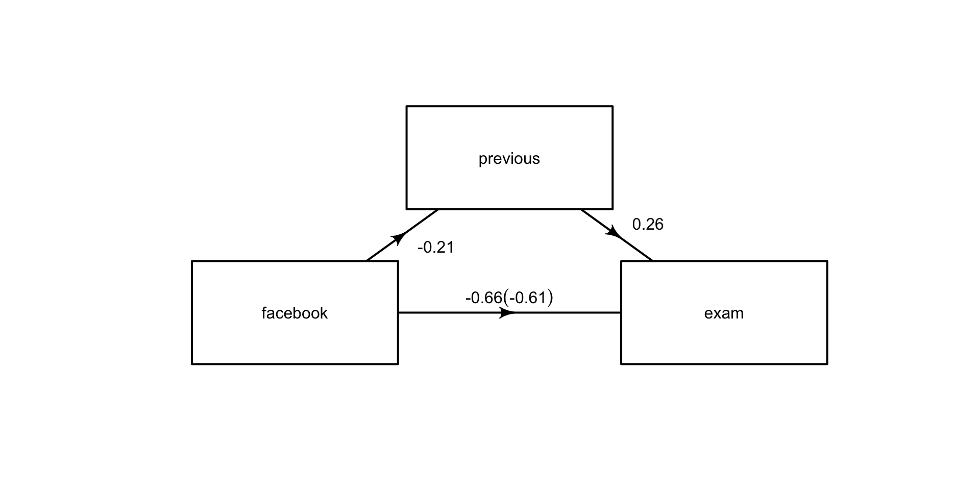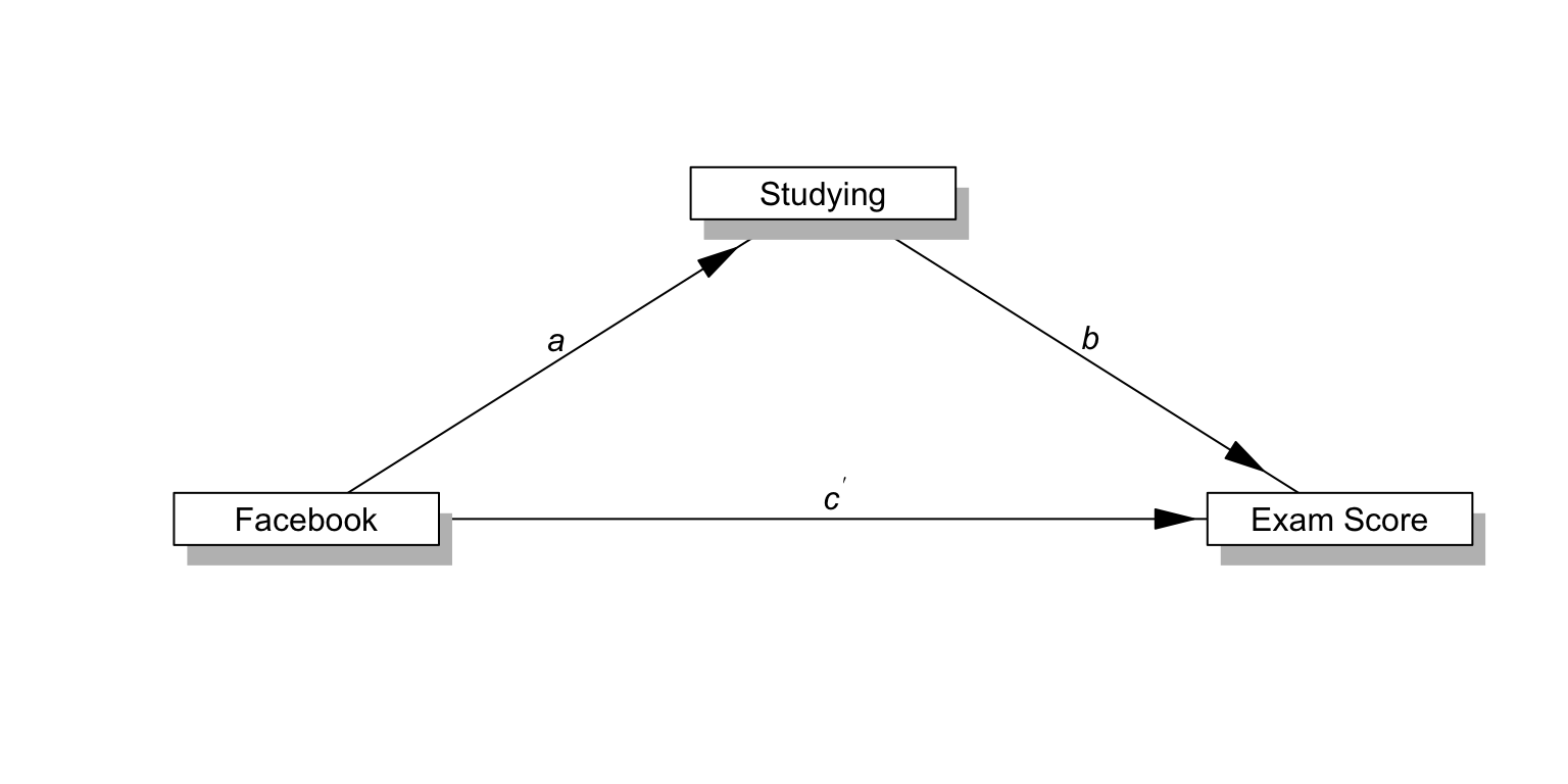Controlling for previous studying, Facebook time negatively impacts exam scores (c’ path = -0.61)