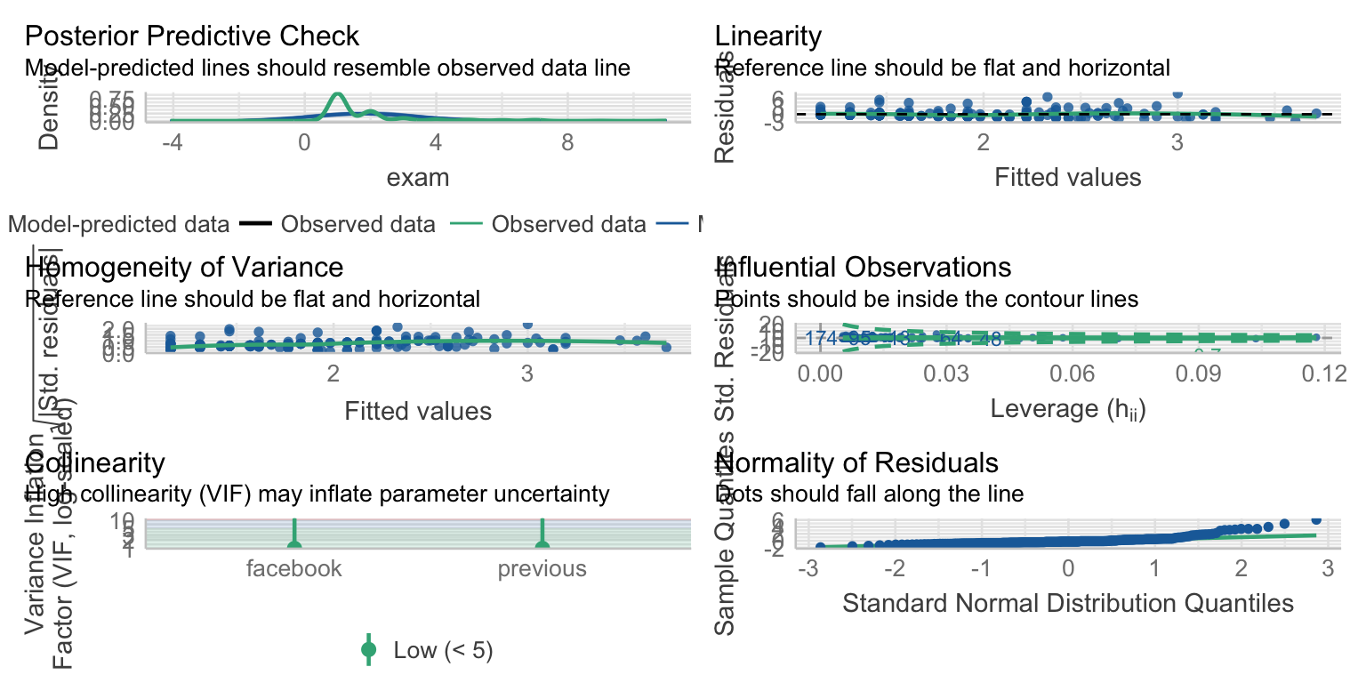 Controlling for Facebook time, previous experience positively impacts exam scores (b path = .26)